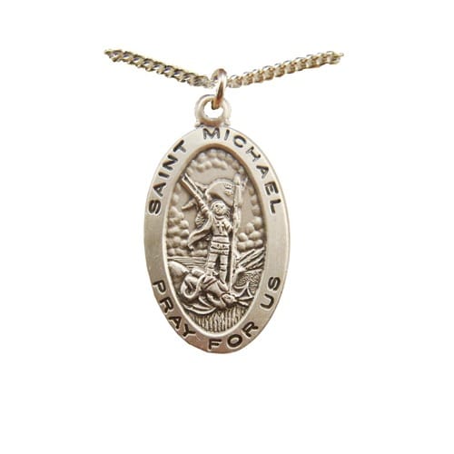 1 inch SS St. Michael Medal on 18 inch rhodium chain. Gift box included.